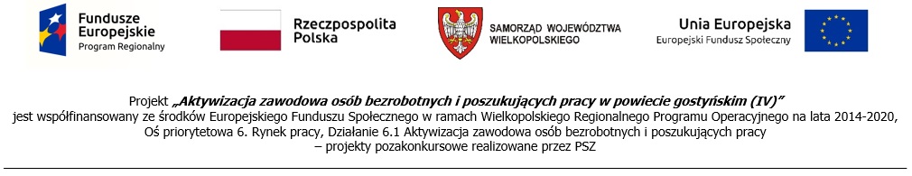 Powiatowy Urząd Pracy w Gostyniu informuje, iż posiada środki finansowe dla 23 osób (4 kobiet i 19 mężczyzn) w ramach projektu: „Aktywizacja zawodowa osób bezrobotnych i poszukujących pracy w powiecie gostyńskim (IV)". Projekt jest współfinansowany przez Unię Europejską ze środków Europejskiego Funduszu Społecznego oraz z budżetu państwa w ramach Wielkopolskiego Regionalnego Programu Operacyjnego na lata 2014-2020, Oś priorytetowa 6. Rynek pracy, Działanie 6.1 Aktywizacja zawodowa osób bezrobotnych i poszukujących pracy – projekty pozakonkursowe realizowane przez PSZ.